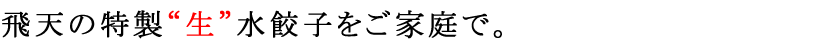 | 【素材について】 餃子の皮はモチモチで、中身の具には、上質な豚肉と新鮮な長葱、キャベツ、生姜を使ってサッパリとした食感と 品格を持たせました。ニンニクは使用しておりません。 この飛天特製の水餃子は「なま」です。必ず冷凍庫で保存して下さい。賞味期限は、冷凍庫保存で製造日から180日です。 |